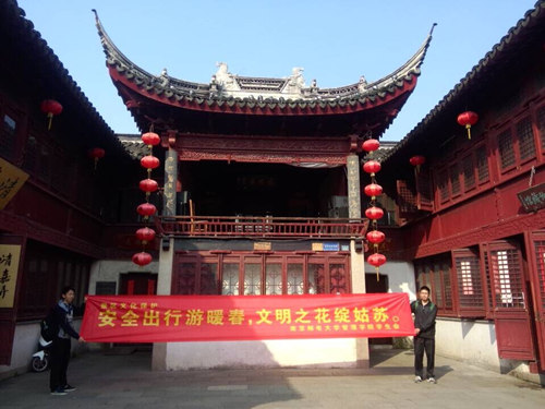 草长莺飞的四月,是外出旅游的好时机。但是由于景区游客数量庞大、人员复杂,随之而来的人身风险、财产风险却为行程增添了不少麻烦。另外,一些游客只顾自己的兴致,随意踩踏花草、乱刻乱涂,着实是对景点的伤害。为此,管理学院学生会文化部的成员来到苏州山塘街和网师园,拉起标有“安全出行游暖春,文明之花绽姑苏”字样的横幅,向游客发放宣传单,讲解旅游时要注意的事项。活动过程中,他们表述简易清晰、仪态大方,积极地与游客交流,以期获得最好的讲解效果。许多游客被吸引过来,认真聆听他们的宣传讲解,并表示会提高安全防范意识、做一个文明有礼的游客。