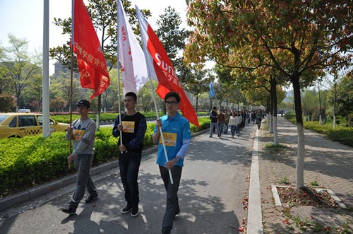 本次活动通过阳光行走的方式为西部地区的女孩筹集善款,每个活动参与者只要扫二维码,花一分钱购买商品,苏宁易购就会相应捐出十元钱到西部地区。活动开始前,全体同学井然有序地聚集在手球场参加“关爱女孩,阳光行走”活动的启动仪式。仪式上,苏宁易购的马康先生、分团委书记华奕曦老师、辅导员陈大鹏老师分别发表了讲话,激励同学们尽力走完全程,为帮助西部地区的孩子出一份力。讲话完毕后,同学们再一次整理好队伍,迎着朝阳,怀着一颗助人之心开始了自己的阳光行走。整齐的队伍,矫健的步伐,青春洋溢,满怀爱心的同学们在林荫道上全力奔走着。七公里的路程,没有人叫苦,也没有人喊累,更没有人中途放弃。他们不惧劳累,努力向前,坚持不懈,都以帮助西部地区小女孩为目标,陆陆续续的到达了终点。所有同学到达后集体合影留念。至此,本次活动圆满结束。
