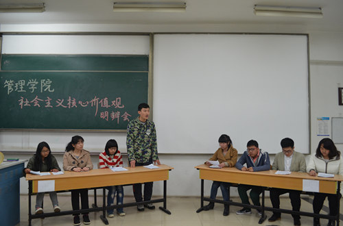 为开展和践行“社会主义核心价值观”主题活动,正确引导青少年主流观念认识。2015年3月15日和22日,由管理学院分团委组织的管理学院大一学生明辩会在教三召开。到场的评委有学生会主席杨雨婷,青年志愿者协会主席周阳,科学与技术协会主席严俊洁,听风文学社社长姚元灿。