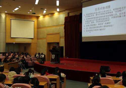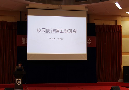 2015年11月2日16时,南京邮电大学管理学院2015级新生于三牌楼二楼报告厅参加了由保卫处举办的校园防诈骗主题班会。保卫处刘庆霄老师主持了此次班会,并从最常见的诈骗类型及其方式到防范建议都做出了深入剖析。此次班会既为校园安全敲响了警钟,又让同学们受益匪浅。