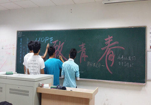 活动当天阴雨连绵,但是同学们的热情并没有受到天气影响,他们依然坚持准时到了教室。教室黑板上“致青春”的字样,引起了大家的美好回忆。首先,班长与大家共同交流了曾经的高考留下的深刻印象以及如今的青春给予我们的无限精彩。参与活动的同学们积极响应,纷纷互相交流,讲述自己去年高考的情形,彼时的压力、紧张和忐忑心情,现已成过往烟云,只留下慨叹和回味。随后大家轮流走到黑板前,用粉笔记录下那年心境,怀着激动又感慨的心情,在黑板上写下了自己对高考的回忆、对青春的思考。活动最后,全体参与活动的同学站在教室前进行合影留念,至此,本次团日活动顺利完成。