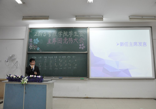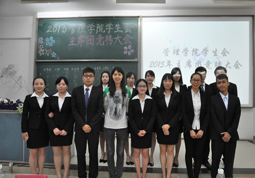 2015年6月17日晚,南京邮电大学管理学院2015年学生会主席团竞聘大会圆满举行。出席本次大会的嘉宾有管理学院分团委书记华奕曦老师、14级辅导员陈大鹏老师、分团委秘书长段风光、科学与技术协会主席严俊洁、管理学院2013学年学生会主席赵洪阳。参加本次大会的有现任主席杨雨婷,副主席胡艳、梅燕妮、李一鸣,学生会全体部员和大一大二学生代表。