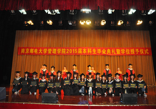 2015年6月18日上午,南京邮电大学管理学院2015届本科生毕业典礼暨学位授予仪式在仙林校区青春剧场圆满举行。管理学院院长殷群教授,院党委书记江森副教授,副院长卢子芳教授、刘立教授、张吟鹤副教授、朱卫未副教授,院长助理曹亚东副教授及财务管理系主任何卫红教授出席了本次典礼,管理学院各系系主任、教师代表、毕业班辅导员老师以及2015届全体毕业生参加了本次典礼。本次典礼由院党委副书记徐斌老师主持召开。