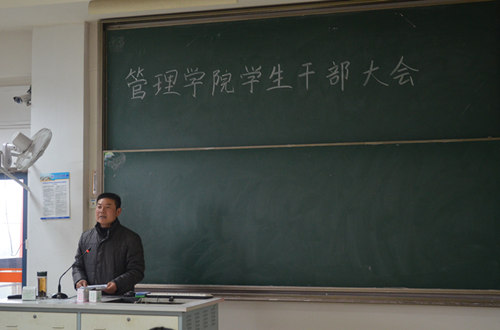 本次会议由院党委副书记徐斌老师主持召开。会上,徐斌书记就以下三点对这一学期管理学院工作进行总结:一、表彰。对管理学院在2014年度各级评奖评优中,个人和集体两方面取得的可喜成绩进行表扬,对老师和同学们的努力工作和优秀表现给予肯定。希望管理学院进一步提高集体的凝聚力、向心力、战斗力,脚踏实地、正确认识已有成绩,坚持不懈,向标准看齐。另提出建议,作为学生干部,应带领同学们积极关注我们的家园“南京邮电大学管理学院”网站,体验学习、认识、提高的过程,为未来在信息化社会中工作奠定良好基础。二、总结。对这一学期的学风建设(三点一线:课堂、宿舍、食堂)进行归纳总结,并表示尚有待提升。一方面,学习是学生的根本任务,而高出勤率可以体现良好的学习态度;另一方面,宿舍文化建设是学生生活的重要组成部分,我们应加强集体观念,营造“家”的氛围。三、期望。首先,作为学生干部,应该在各方各面起到积极带头作用;其次,面对即将到来的期末考试,希望大家全身心投入复习,真正践行“诚信”二字,遵守校规校纪,用实力为自己交上满意的答卷;最后,积极参与早操锻炼,提高自己的身体素质,做到全面发展。