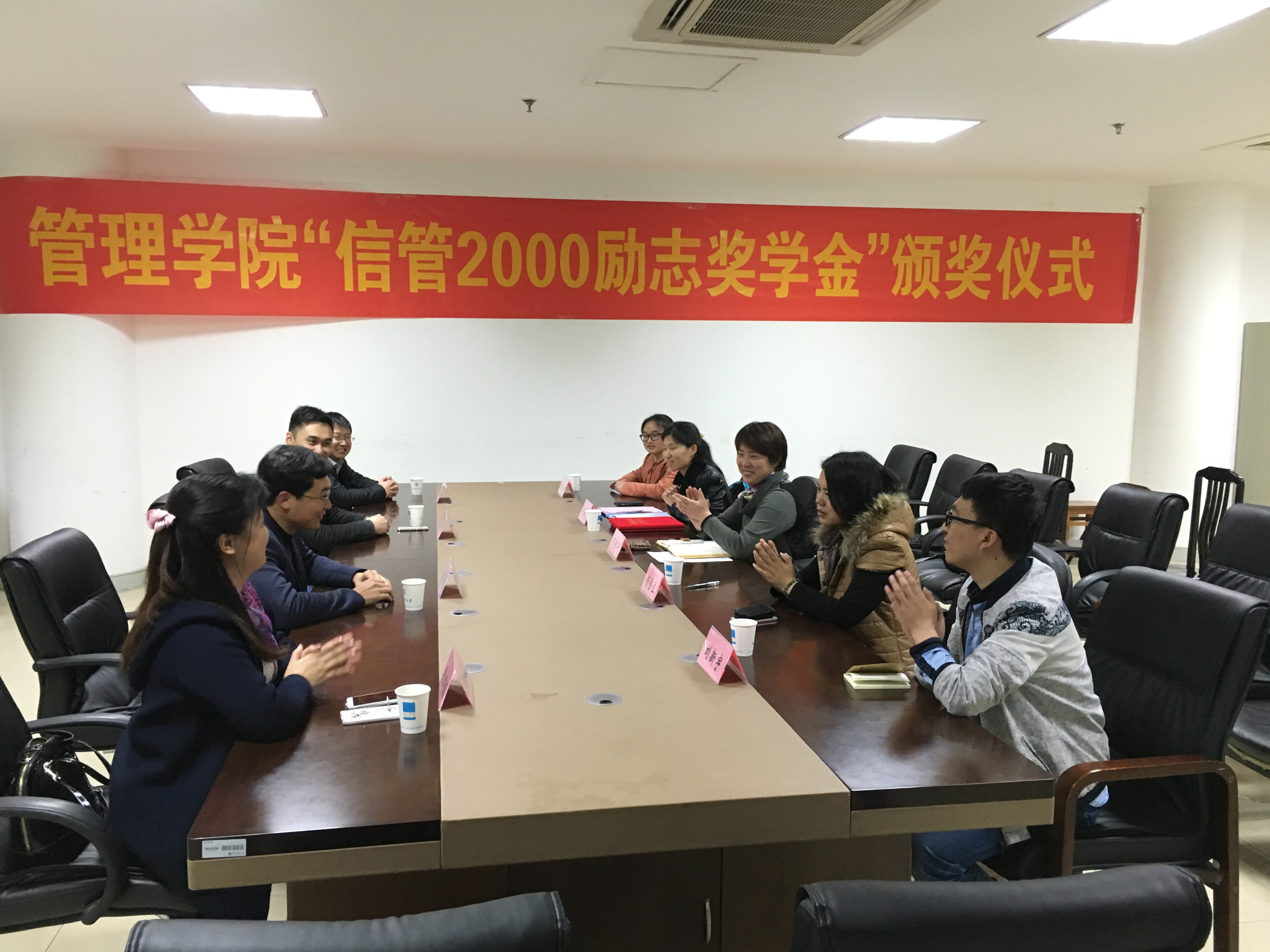 2016年3月29日,管理学院“信管2000励志奖学金”颁奖仪式在圆楼三楼会议室举行。2000级信息管理与信息系统专业辅导员杨健老师,同学会代表张建颖、孔祥旭、沈超,管理学院党委副书记邓艳华及相关辅导员出席仪式,并与获奖学生进行交流。仪式由管理学院辅导员赵春梅主持。