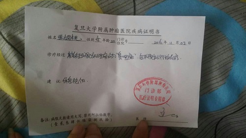 此刻,她正在复旦大学附属肿瘤医院接受治疗,原本阳光质朴、活泼开朗的女生陡然陷入了与病魔的斗争中,进行着生与死的较量,医生说她很有可能痊愈,有希望重返校园,但治疗费用估计在六十万左右。对于这个本已艰难却接连遭受打击的贫困家庭,六十万治疗费用无疑是一个天文数字!