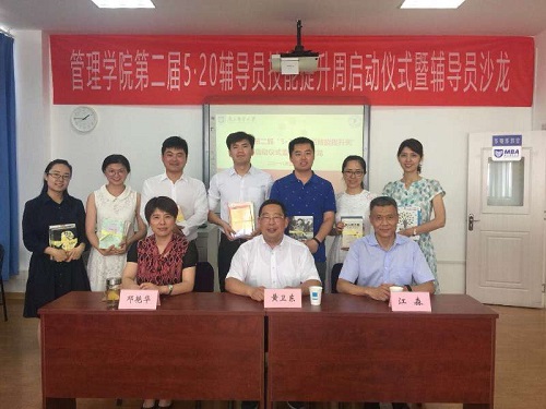 启动仪式伊始,管理学院院长黄卫东、党委书记江森代表学院为我院辅导员老师们赠送了书籍,勉励大家在工作中以立德树人为根本,提高自身的育人本领和管理艺术,结合当代大学生的心理特点,不断探索、创新工作理念和方法,真正成为大学生的人生导师和知心朋友。随后,全体辅导员老师在学院分团委书记刘晓宁的带领下,重温辅导员誓词,不忘初心,砥砺前行。接着原南京邮电大学通达学院资深辅导员冯毅老师介绍了自己即将出版的16万字作品《为了桃李芬芳——辅导员工作全纪实》的初衷,与大家分享了自己多年辅导员工作的喜悦与感悟。冯老师指出,辅导员工作是党的教育事业之重要阵地,大家要满怀赤诚之心,深入学生,掌握动态,为人师表、言传身教,以爱心、良心、恒心形成教育的合力,扎扎实实地做好辅导员工作。