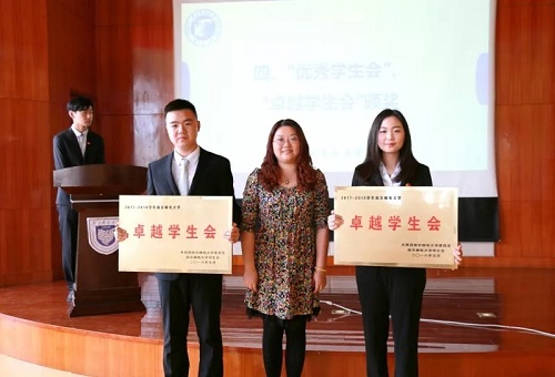 风采展示环节上,管理学院学生会主席修振博同学从思想引领、成长服务、权益维护、学生服务及组织建设等方面总结了一年来取得的成果,并对新一年的学生会工作进行了展望。互动交流过程中,他结合学生工作的实际情况,认真反馈评委老师提出的问题和意见。依据会前评分、网络支持得分、风采展示得分和现场投票得分,管理学院学生会凭借一年来的工作付出、评选活动期间认真整合资料、齐心协力的大力宣传及评选现场的出色表现,最终获评南京邮电大学“卓越学生会”及“优秀学生会”两个荣誉称号。由文化艺术中心主任、团委副书记王小露老师为我院学生会颁奖。