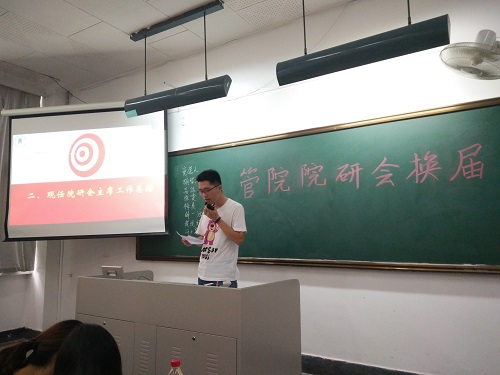 大会共分为六个部分,首先由研究生辅导员华奕曦老师进行嘉宾讲话。华老师对上届管院研会的付出作出了肯定与表扬,同时也对下一届的研会的发展表达了深切的期待。接着现任主席赵海超同学总结了这一年来研会的工作,肯定并感谢老一届成员对研会做出的牺牲和贡献,简述了研会的活动及工作情况,鼓励下一届研会成员要用良好地心态去迎接往后的学习和工作并对研会今后的发展提出了要求,做出了展望。