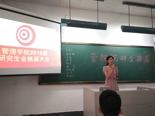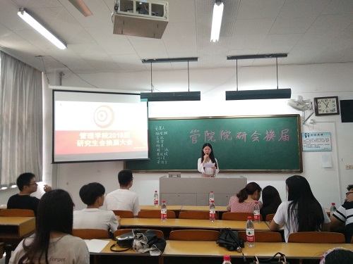 9月12日下午1点,管理学院研究生会于教西102教室召开新一届主席团换届选举大会。出席本次会议的嘉宾有研究生辅导员华奕曦老师、2017届管理学院研究生会主席赵海超同学、副主席梅馨心同学、2018届管理学院学生会主席张星星同学、研究生会各部门部长以及各年级学生代表。本次换届大会由2018级MPAcc专业王鑫同学主持。