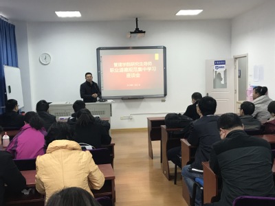 2018年11月21日,管理学院组织召开研究生导师职业道德规范集中学习座谈会,会议由学院分管研究生教学工作的副院长朱卫未教授主持,管理学院全体导师(含兼职导师)参加本次集中学习与座谈。