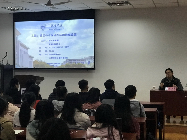 2018年12月5日,管理学院在MBA教育中心举行了关于“4+2”保研方法和推免政策宣讲会,管理学院2016级符合保研条件的本科生参加了本次宣讲会。会议由管理学院副院长朱卫未教授主讲,学院党委副书记邓艳华副教授参加了本次宣讲。