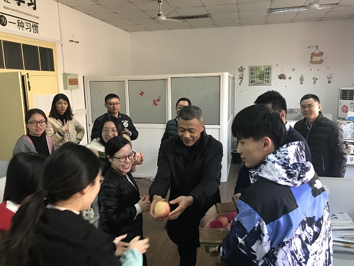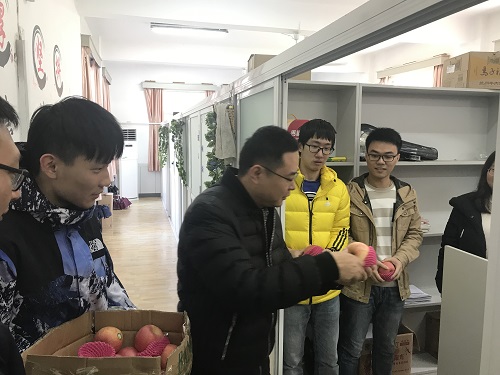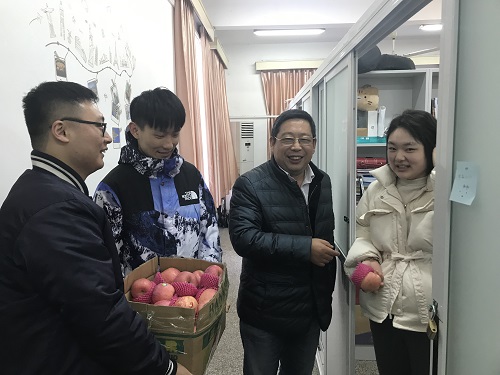 2018年12月24日上午10点左右,有线楼管理学院的六个教研室里传出阵阵欢乐的笑声。管理学院院长黄卫东、党委书记江森、副院长卢子芳、副院长朱卫未、副书记邓艳华、研究生辅导员华奕曦带着满满两箱红彤彤的大苹果去看望正在教研室学习的研究生。正值平安夜,把平平安安的祝福、暖人心的话语送给同学们。