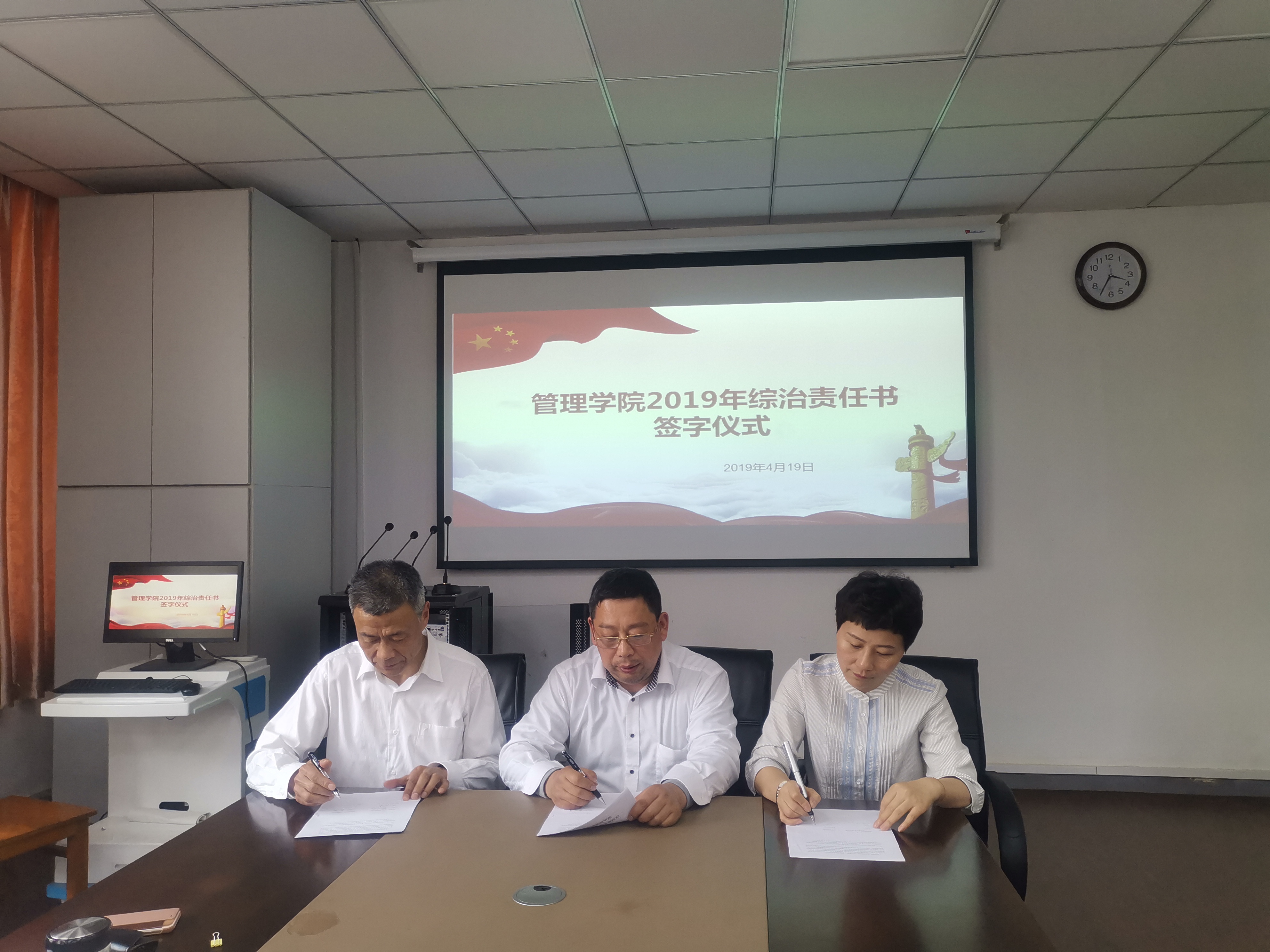 最后,黄卫东院长和江森书记代表学院和各三级机构负责人签订了2019年综治责任书。