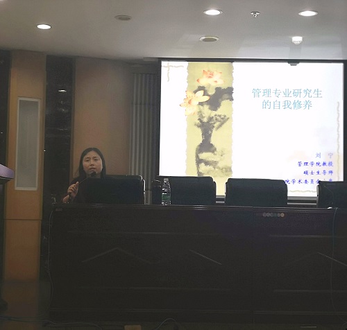 见面会结束后开始了今年见面会的一个特殊环节——入学教育,我院的刘宁教授给同学们带来了开学第一课——管理专业研究生的自我修养,刘宁教授首先介绍了管理专业的研究特点以及研究者迷失问题,对此刘宁教授提出三点建议:首先,端正科研价值观,提升道德修养。其次,要学习研究方法,提升科学修养。最后,要注重拓宽视野,提升综合修养。在本次讲座中,刘宁教授特别提醒同学们要学贯中西,在阅读中文专业书籍的同时也不能减少对外文研究书籍的营养汲取。