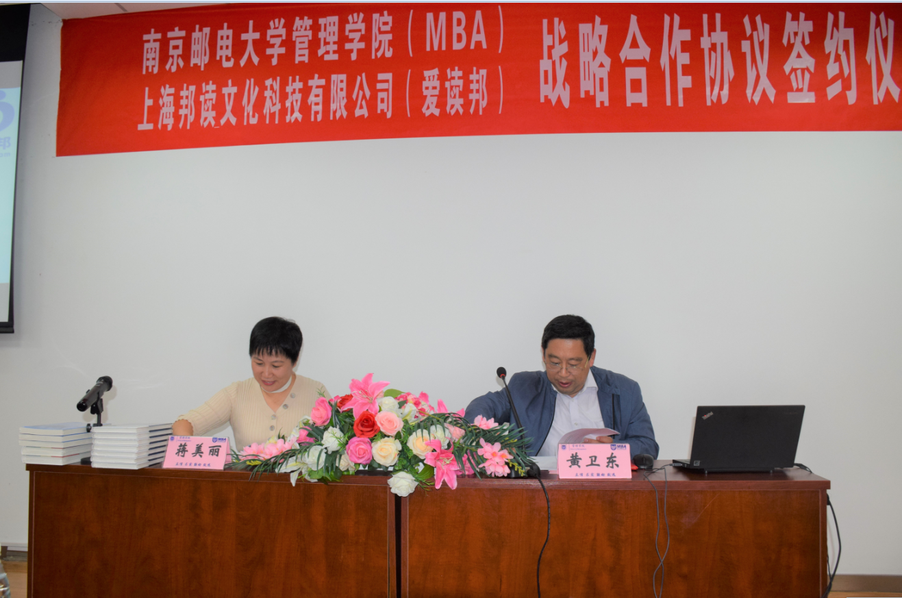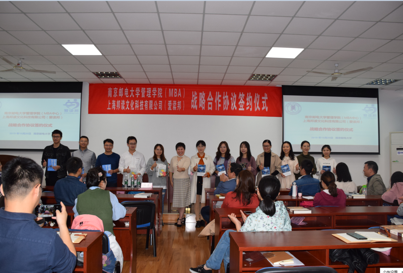 2019年10月20日上午,管理学院与上海邦读文化科技有限公司战略合作协议签约仪式在MBA教育中心举行。来自上海邦读文化科技有限公司(简称爱读邦)总经理蒋美丽女士与南京邮电大学管理学院院长黄卫东教授出席了本次签约仪式。签约仪式由MBA教育中心副主任孙建敏老师主持。2018级、2019级学员们共同见证我院与爱读邦达成战略合作。