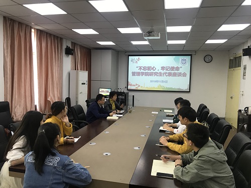 11月4日,管理学院召开“不忘初心、牢记使命”研究生代表座谈会。各年级各专业学生代表参加本次座谈会,学院朱卫未副院长和邓艳华副书记参加了本次交流。