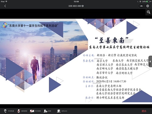 2020年6月5日下午2点,东南大学第七届“至善东南”在宁高校研究生财经论坛如期在腾讯会议平台举行,本次论坛主题是“新经济·新引擎打赢脱贫攻坚战”。本次论坛的参会高校有南京大学、东南大学、南京航空航天大学、南京邮电大学等十所高校。我校管理学院魏宁、孟楚悦、肖丹、王侃亮、谢梦五位研究生代表学校参加了本次会议。