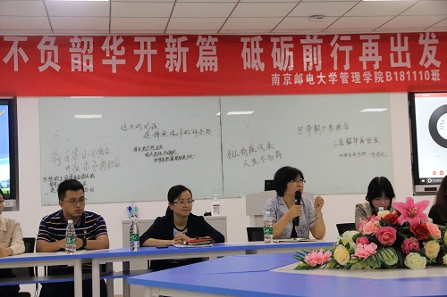 随后,同学们以小组讨论的形式分别向姜总会计师、华阳老师、丁仪老师询问了考研、就业、入党等相关问题。三位老师分别分享了自己的经验,希望通过这种方式为同学们排忧解难。在提问环节,针对王蕾同学提出的“作为南邮工科背景的学生如何提高自己的竞争力”这一问题,姜总会计师给出了如下建议:“南邮学子要随时做好准备,做最好的自己,在大数据时代,提高自身综合素质和能力,做一个复合型人才,才能提高自己的竞争能力”。丁仪老师对本次班会进行了简要总结。在班会的尾声,并姜总欣然与同学们合影留念。