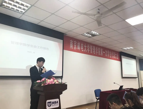 本次大会共分为四项议程:管理学院学生会主席团候选人巩海旭做工作报告、选举南京邮电大学第十七次学生代表大会代表、选举2020届管理学院学生会主席团以及大会闭幕。