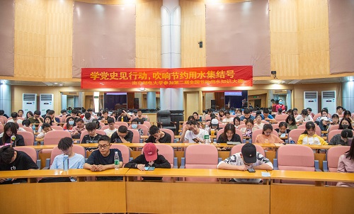 随后,同学们观看了节水行动宣传视频,鼓楼区模范马路社区、鼓楼区水务局的同志从水资源的重要性、《国家节水行动方案》解读等方面为大家讲解了节约用水的历史背景和重要现实意义。在活动现场,同学们在印有“学党史见行动,吹响节约用水集结号”的横幅上签名,参观了节约用水展板,参与了全国节约用水知识竞赛。