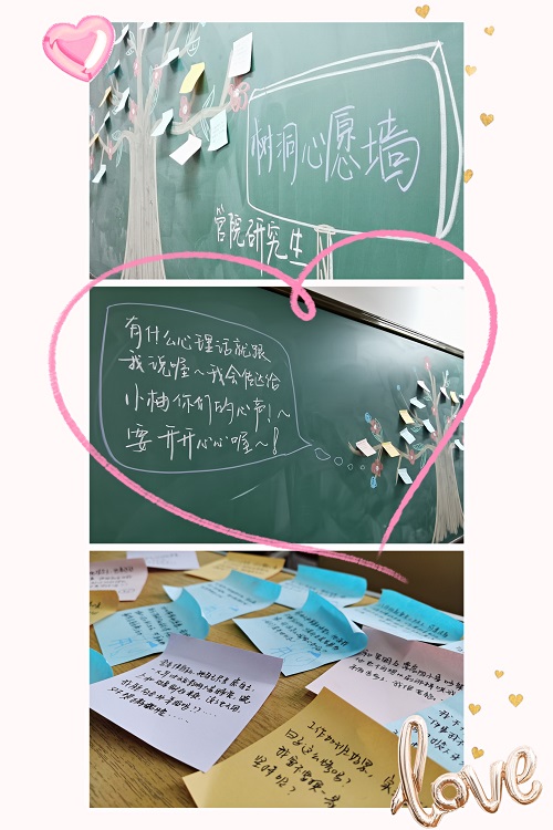 活动共分为两个部分,第一部分为树洞心愿。研究生们将自己的心理路程诉诸于纸上,或关于学业,或关于感情,或关于工作,基本涉及了生活的方方面面。除此以外,想说的话、自我自愈的小故事等种种形式的内容都被提及,跃然于“树”上。管理学院各班级的心理委员们主动剖析纸上文字,逐条整理,找到潜在的问题,巧妙的予以回复开导,将隐患消除于初期。