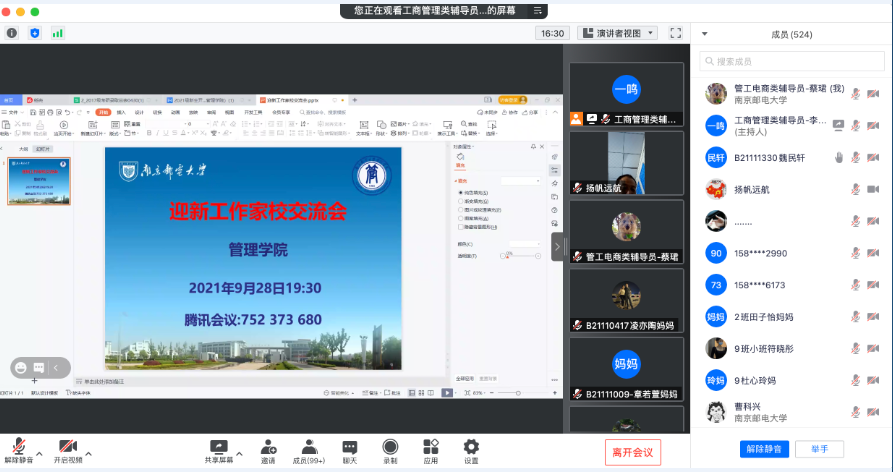 为充分解释说明我院在疫情防控背景下的迎新工作安排,帮助2021级本科新生和家长更加全面了解学校迎新各项准备工作,实现家校直接“零距离”交流沟通,9月29日晚上七点半,管理学院组织召开了2021级本科新生线上家长会。管理学院党委副书记、副院长郭强,新生辅导员李一鸣、蔡珺,2021级全体456名本科新生及家长参加了此次会议。