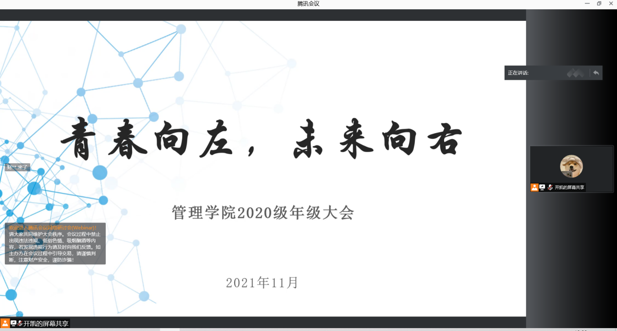 为帮助管理学院2020级全体学生更好了解今后发展的主要方向,帮助学生在大二学年更好的明确自身的学业发展和职业规划,12月5日晚,2020级年级大会在腾讯会议线上举行,会议由2020级辅导员开凯主持,2020级5个专业454位学生及部分学生家长在线参与、交流互动。