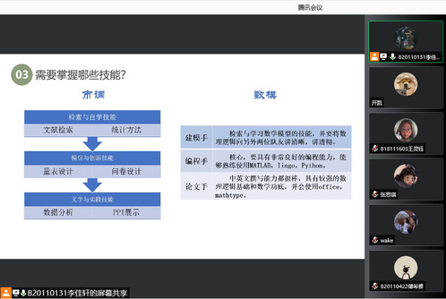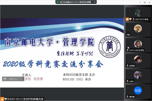 为帮助管理学院2020级学生更好了解学科竞赛的有关情况、提前准备、提高成绩,由本科2020级党支部主办、B201102(GG)班团支部承办的2020级竞赛交流分享会于12月10日晚通过腾讯会议线上举行,2018级竞赛成绩突出的学生代表张思琪、王灵钰做交流分享,2020级120余人参与此次讲座。