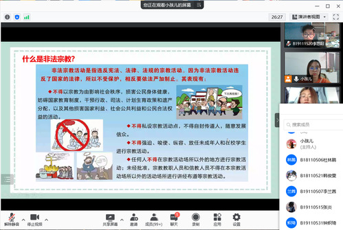 针对校园内传教的非法行为,宋晓含老师指出遇到该情况应沉着冷静、果断拒绝并及时上报,党员同学更应坚定无神论、正确理解宗教信仰自由。宋晓含老师再次强调宿舍用水用电安全,谨防诈骗行为,并结合当前疫情形势呼吁同学们缩小活动范围、非必要不离校离宁。