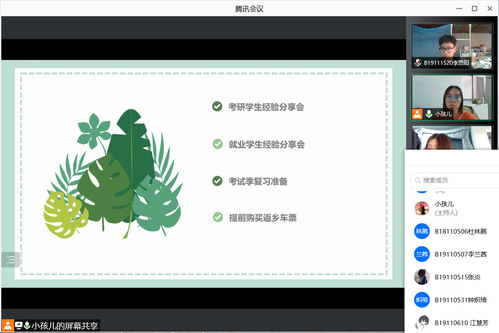 12月15日下午,管理学院本科2019级市场营销、财务管理、信息管理与信息系统专业年级大会通过腾讯会议以线上方式举行。本次大会由本科2019级辅导员宋晓含老师主持,3个专业全体学生参与。