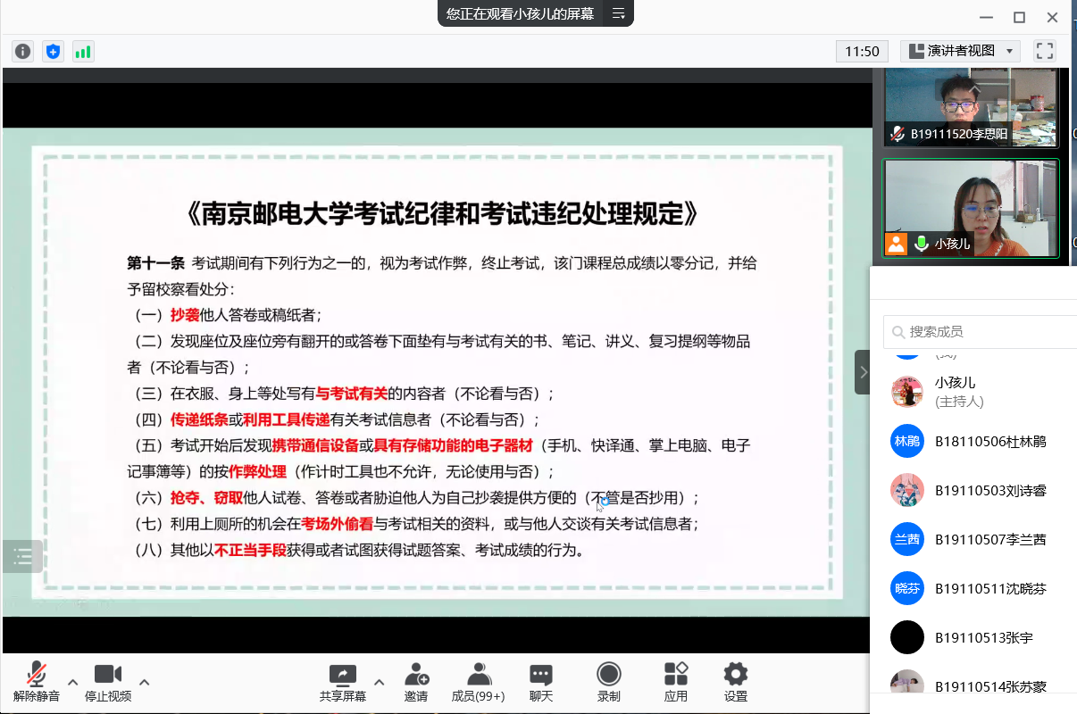 会议伊始,宋晓含老师就“诚信考试”主题发表讲话,介绍了我校对考试违纪行为及作弊行为的处理规定,强调了端正考风、严肃考纪的重要性。宋老师鼓励同学们利用好接下来一个月的复习时间,认真备考,争取在考试中取得好成绩。对于2019级学生将面临的未来发展方向选择问题,宋晓含老师呼吁同学们积极参与学院即将举行的考研学生经验分享会和就业学生经验分享会,以更好明确目标、早做准备。