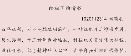 本次活动主要面向管理学院研究生,旨在以简练精致的“三行情书”的形式,表达对祖国母亲的热爱,对家人的牵挂,对情侣的告白、朋友的祝福以及对往事的追忆。此次活动得到了研究生们的一致好评,各级研究生们积极投稿、踊跃参与。大家用寥寥数语,三行文字来表达内心的情感,展现心中的悸动。