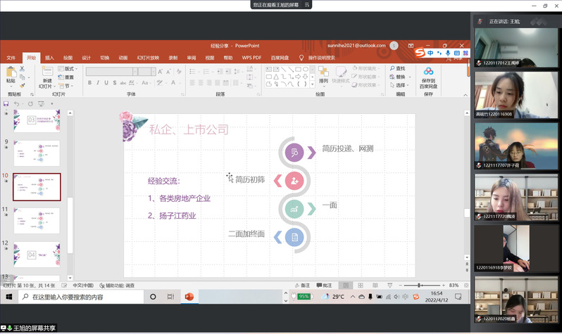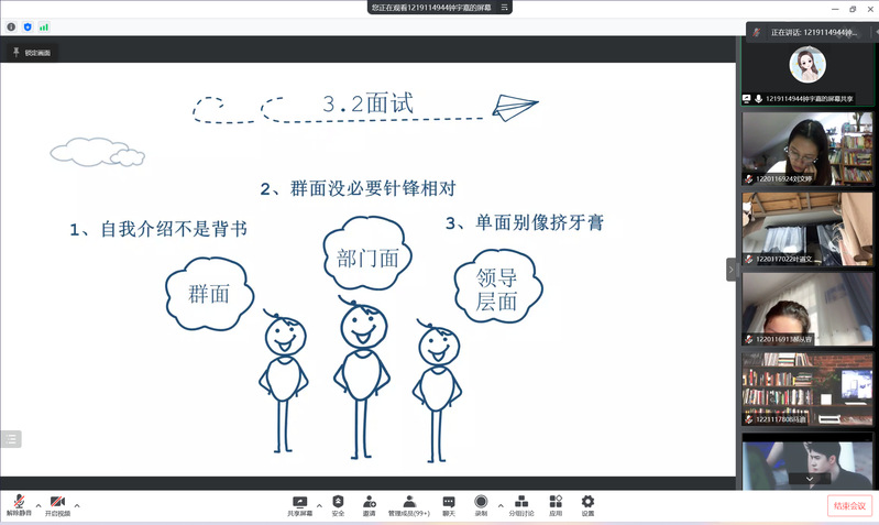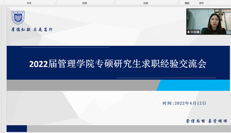 以经验为马,以汗水为泉。4月12日下午,“管理学院会计专硕求职经验分享会”在腾讯会议APP上如期举行。本次活动由管理学院研究生会承办,邀请了管理学院研究生辅导员华奕曦老师作为与会嘉宾和四位在求职就业方面有代表性的研三同学作为主讲人,为管理学院研一、研二的会计专硕研究生们分享他们在求职工作中的宝贵经验。