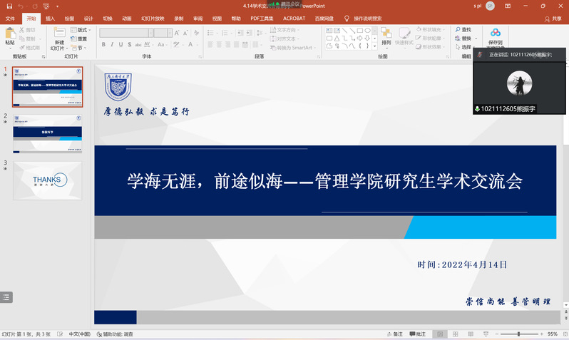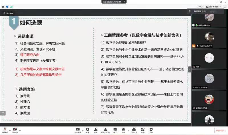 此次线上科研交流会,让研究生们对自己的科研方向有了更加明晰的认知,科研写作动力有了大幅度的提高,同时,使学院的科研氛围进一步浓厚。通过这次科研经验交流会希望管理学院的研究生在未来能够以经验为马,以汗为泉,在科研道路上大放异彩!