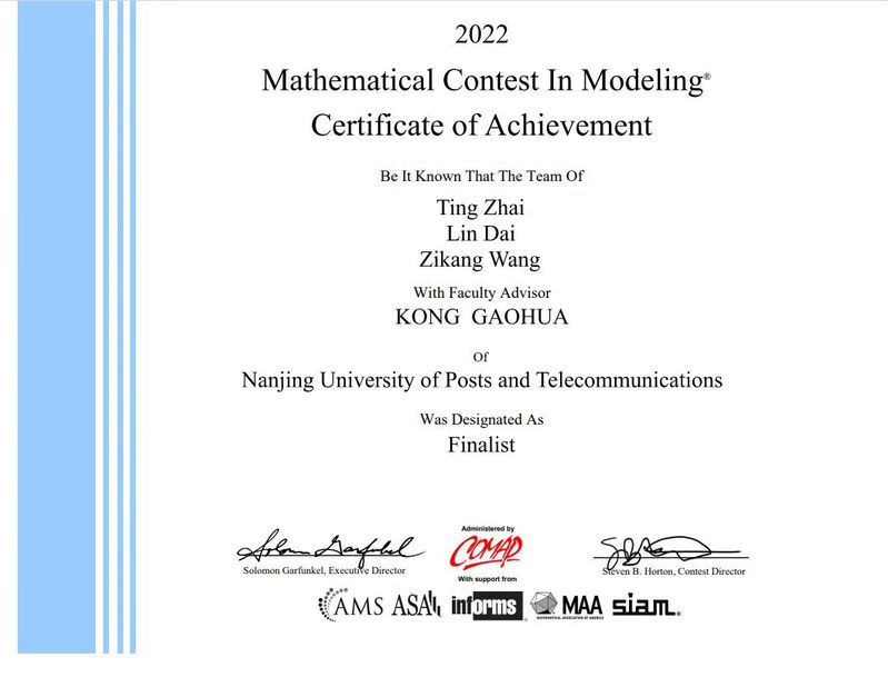 此次大赛吸引全球来自不同高校的超过28000支队伍,经过激烈的角逐,我院B20111121张惟天、B19111510徐珍旎、B19111137翟挺所在三组均获得Finalist奖(特等奖提名奖),另有其他学生也有Meritorious Winner(一等奖)、Honorable Mention(二等奖)等优异表现。