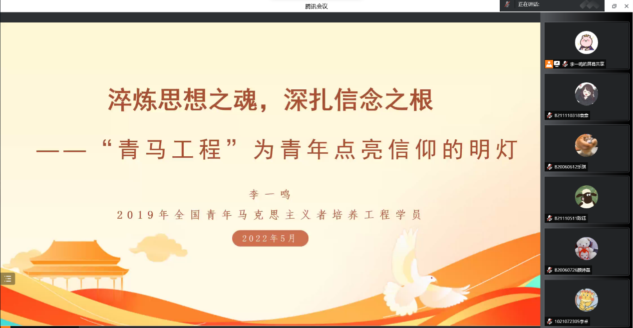 6月2日,管理学院菁英人才学校培训班第四次课程通过腾讯会议平台顺利进行。本次课程邀请了管理学院辅导员、本科2021级党支部书记、2019年全国青年马克思主义者培养工程学员李一鸣老师,为广大学员带来以“淬炼思想之魂,深扎信念之根——‘青马工程’为青年点亮信仰的明灯”为主题的讲座。