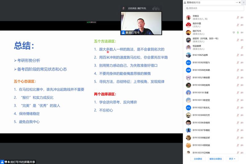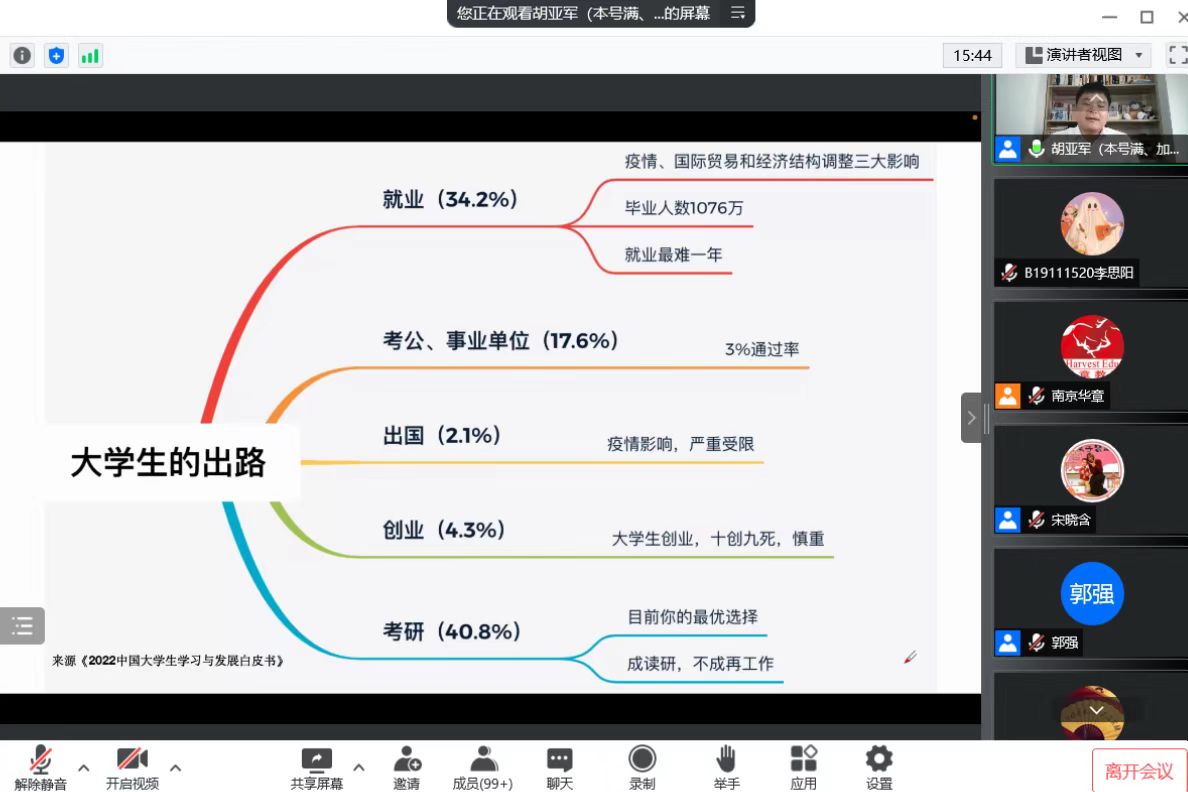 为进一步帮助同学们认清就业及考研形势,提供合理化、科学化考研指导,规划未来发展方向,实现精准学业帮扶,6月9日下午,管理学院特邀优秀校友胡亚军,管理类专业硕士辅导讲师王诚为本科2019级学生提供专业指导。本次讲座通过腾讯会议以线上交流方式举行,由管理学院党委副书记、副院长郭强主持,本科2019级全体同学参与。