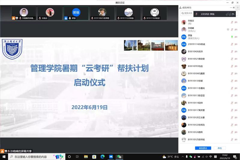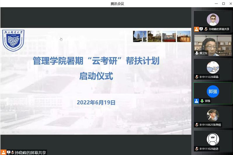 为进一步帮助同学们做好考研准备,向学生及家长说清讲透学院的考研帮扶计划方案,提振学生的考研动力和信心,引导学生家长为居家考研学生创造良好的生活学习环境,6月19日晚我院通过腾讯会议召开暑期“云考研”线上启动仪式。管理学院院长黄卫东教授出席线上活动并作动员讲话,启动仪式由管理学院党委副书记、副院长郭强主持,2019级辅导员孙晓峰、宋晓含两位老师列席,本科2019级全体368名计划考研学生及家长参加了线上活动。