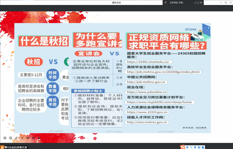 随后辅导员开凯就此前谈心谈话中同学们常见的对于考研和就业的误解,以问答的形式进行集中解答,并以2019级本学年的考研、求职的时间线为例,详细说明各位同学需要准备的工作和相关时间节点。他希望全体同学要深入剖析社会现实、制定切合实际的计划,不要过于盲目自信,避免因自身实力不够造成时间和精力的浪费;同时也希望各位同学不要焦虑,利用大三一年的时间稳扎稳打,完全有机会收获属于自己的喜悦。