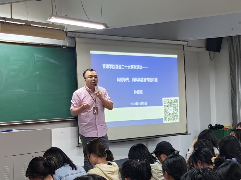 10月5日晚,管理学院在三牌楼校区无线楼举行“喜迎二十大系列活动”——科创争先,商科类竞赛专题讲座,特邀南京邮电大学MBA中心孙建敏老师为同学们带来市场调研大赛、电子商务大赛等商科类竞赛的指导分享。学院各个年级200余名同学聆听了讲座。