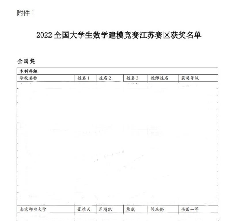 全国大学生数学建模竞赛创办于1992年,是首批列入“高校学科竞赛排行榜”的19项竞赛,也是南京邮电大学认定的四项A类学科竞赛之一。2022年共有来自中国及英国、马来西亚等国家的1606所院校、54257个代表队(其中本科组49424队,专科组4833队)、超过16万人报名参赛。本科组共评出全国一等奖299项、二等奖1146项,全国本科组一等奖的获奖比例为0.605%、二等奖的获奖比例为2.319%。我院学生积极参赛,除获得1项全国一等奖外,还获得江苏赛区一、二、三等奖若干,总体提升较喜人。