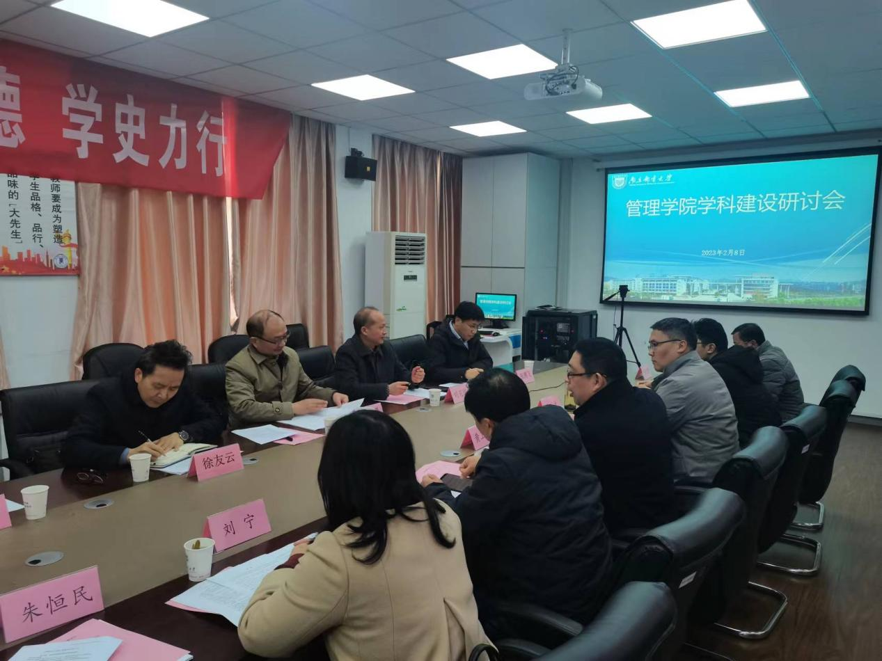 2月8日下午,我院召开学科建设研讨会。校党委常委、副校长王友国,校一流办主任刘芫健,校贝尔英才学院党总支书记张腾飞,校教师工作部部长、人事处处长朱卫未,管理学院院长黄卫东以及学院相关教师共同参会。研讨会由管理学院院长黄卫东主持。