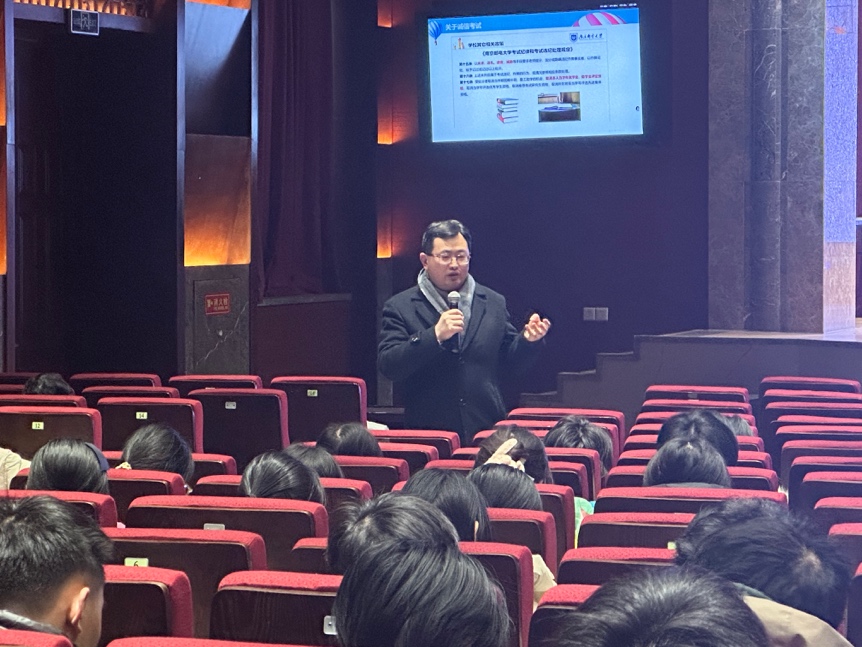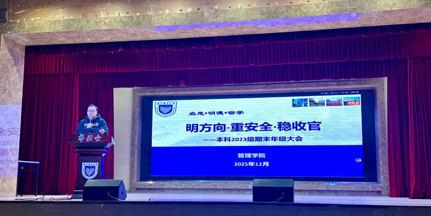 岁序常易,华章日新。为扎实做好期末阶段的学风建设与安全稳定工作,引导广大学子以崭新的精神面貌迎接2026年的到来,12月24日,管理学院本科2023级召开了“明方向 重安全 稳收官”期末年级大会。会议由2023级辅导员孙晓峰、宋晓含主讲,学院党委副书记、副院长郭强出席会议,2023级全体本科生参加会议。