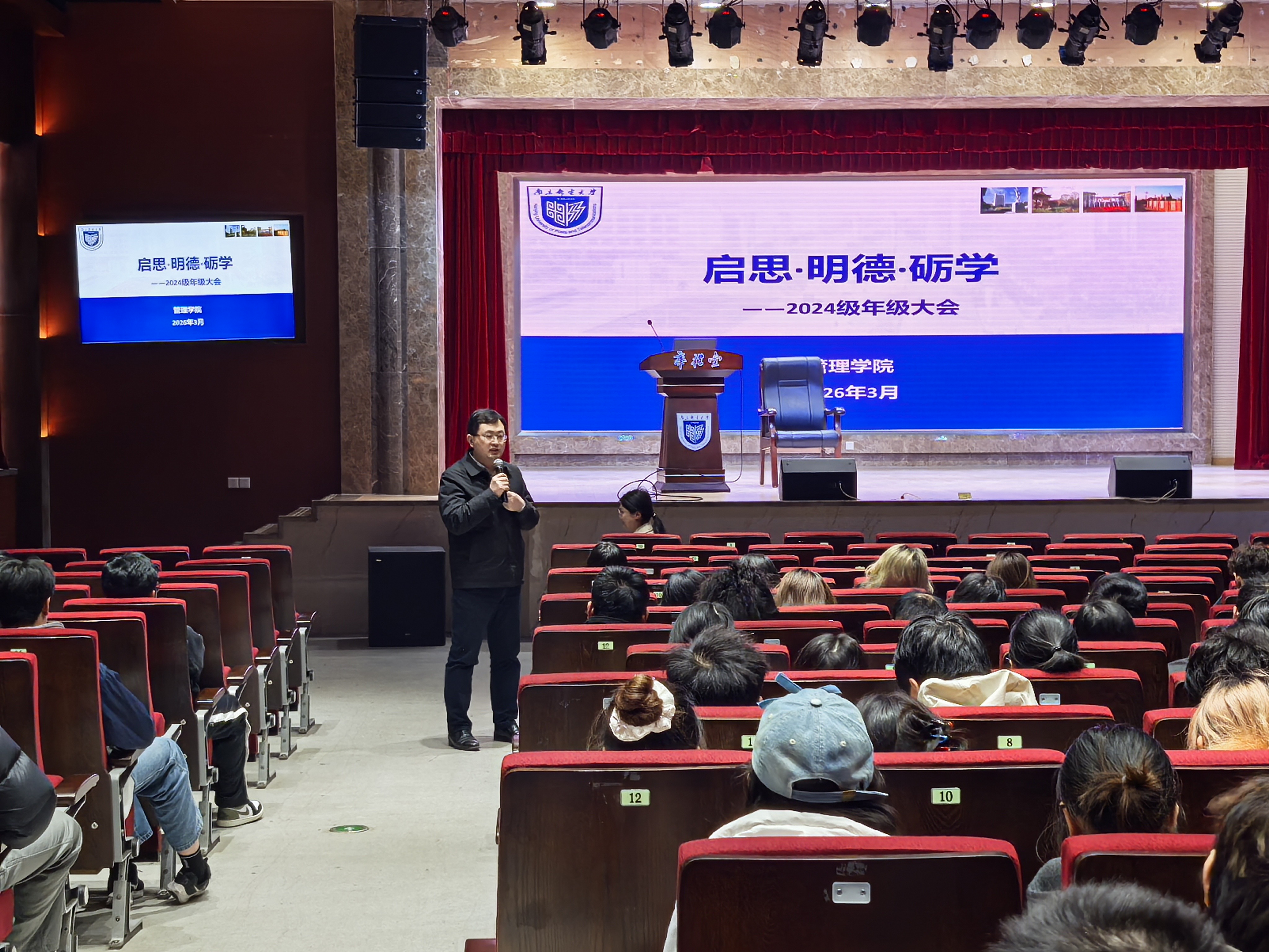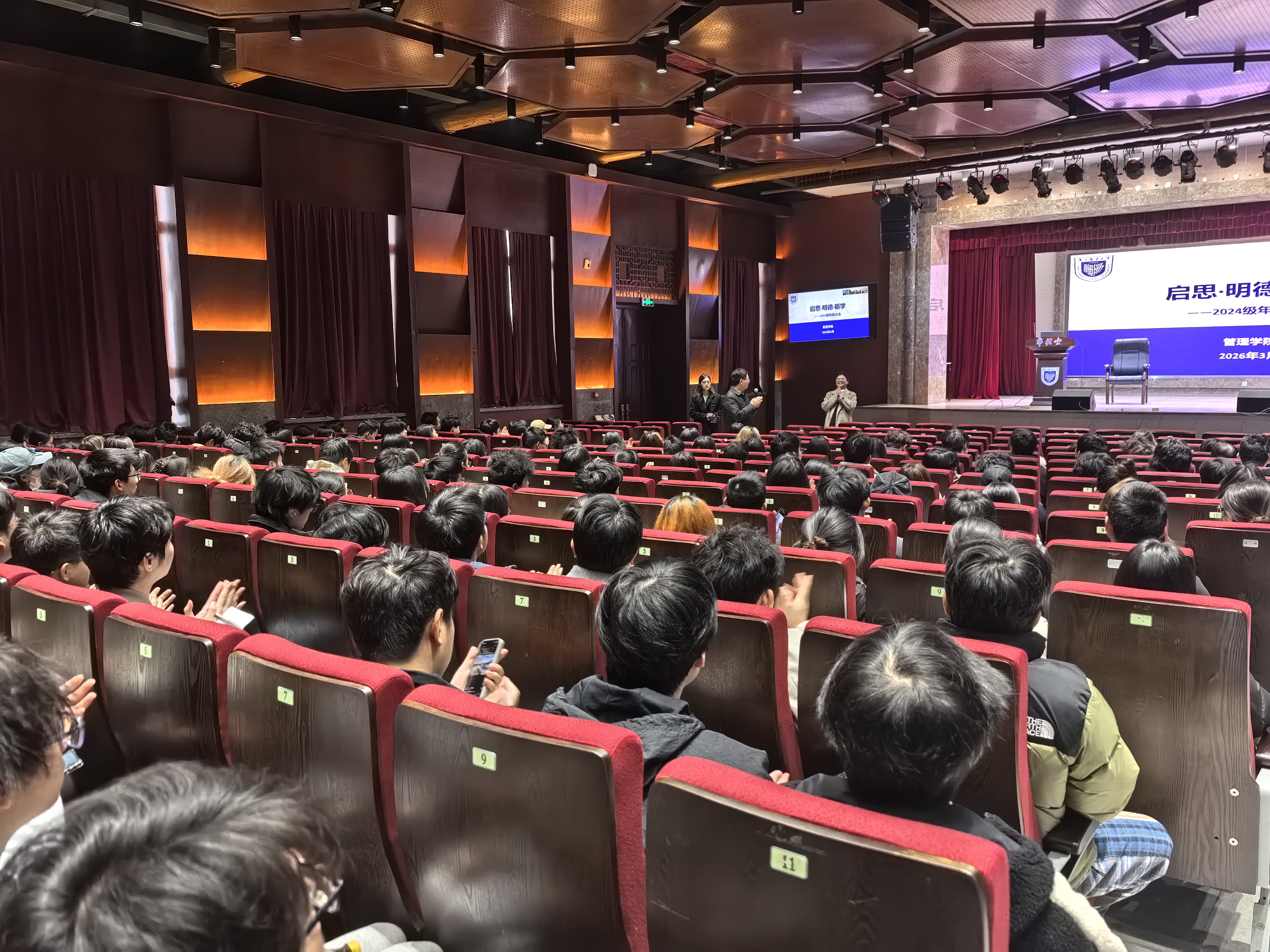 为进一步加强年级日常管理,明确新学期学业与活动安排,筑牢学生安全防线,引导同学们合理规划学习生活,2026年3月19日下午,我院召开2024级本科生年级大会,管理学院党委副书记、副院长郭强教授出席大会,会议由2024级辅导员闾越主持。大会以“启思·明德·砺学”为主题,围绕日常管理、学期安排、重点事项等核心内容展开,为2024级学子新学期的学习生活指明方向。