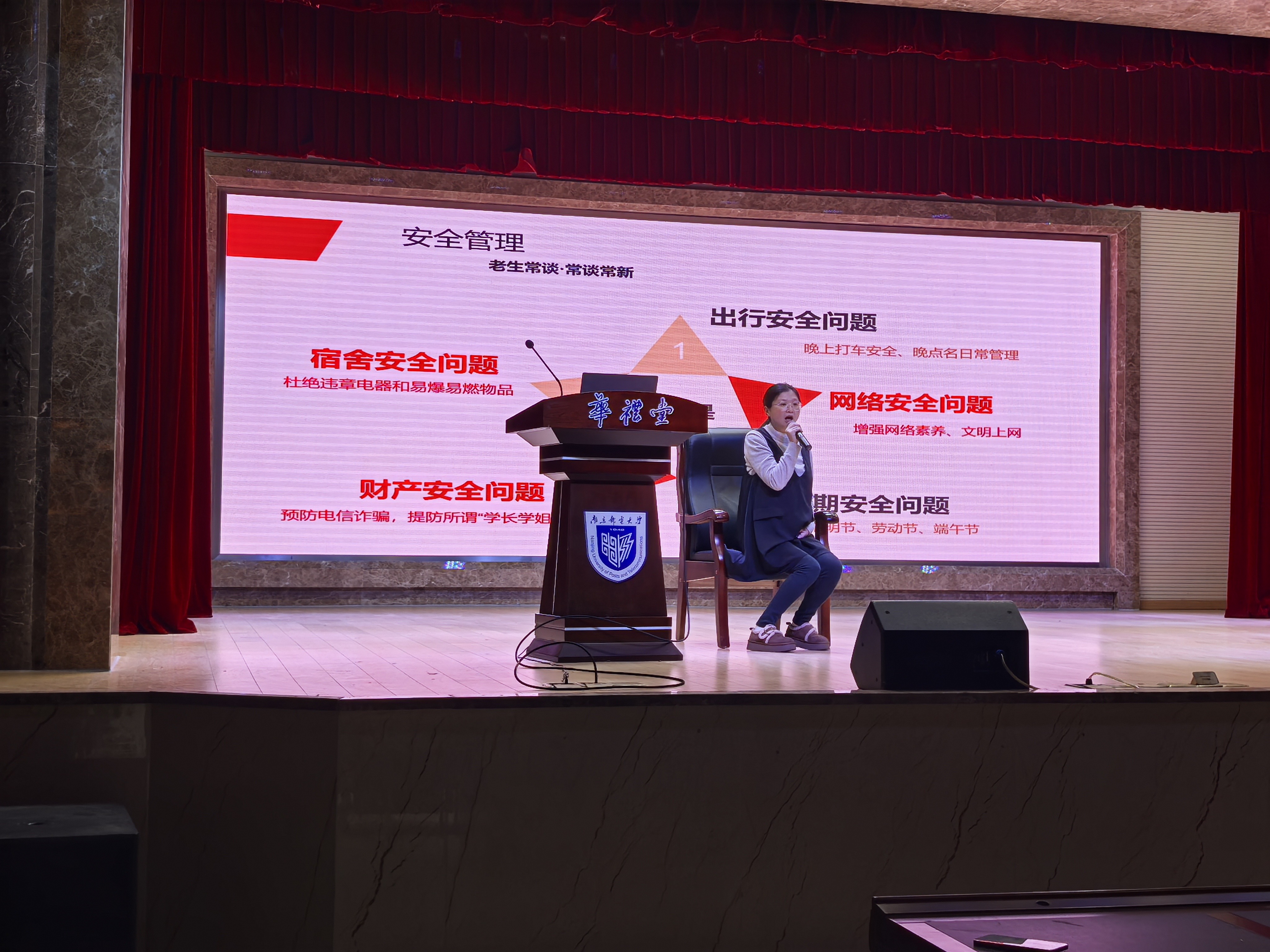 闾越老师聚焦日常管理工作,将安全管理作为重中之重,强调“安全是基础,老生常谈更要常谈常新”。针对出行安全、网络安全、假期安全、财产安全、宿舍安全五大维度作出细致提醒,明确要求同学们提高晚上打车安全意识、配合晚点名管理,增强网络素养、文明上网;警惕电信诈骗与虚假“学长学姐”高薪兼职陷阱;杜绝宿舍违章电器与易燃易爆物品,同时做好清明节、劳动节、端午节等假期的安全防护,全方位筑牢校园安全屏障。